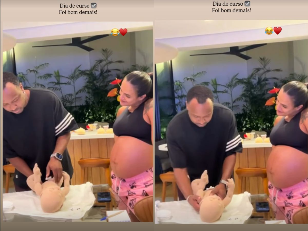 Nos stories do Instagram, Carol registrou um momento divertido em que Thiaguinho treinava a troca de fraldas em um boneco, concentrado na atividade enquanto Carol acompanhava atenta. “Dia de curso. Foi bom demais”, escreveu a influenciadora na legenda do vídeo.