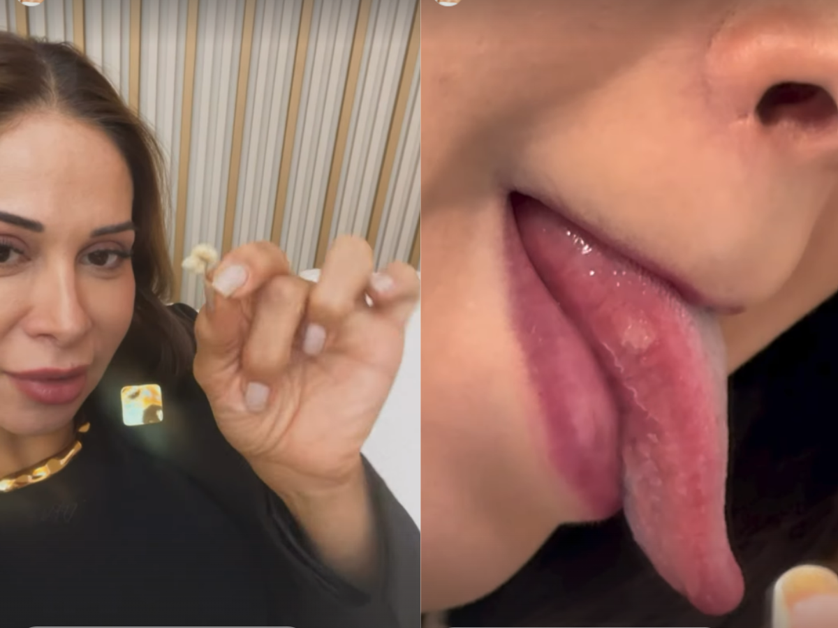 A influenciadora ainda revelou que perdeu um dente recentemente, resultado de uma cirurgia anterior, e que o espaçador colocado pelo dentista caiu, provocando cortes na língua e sangramento. “A massinha do dente que quebrou está cortando minha língua, está sangrando e dói muito. Nem consigo falar direito, e comer é impossível”, contou, mostrando o machucado.