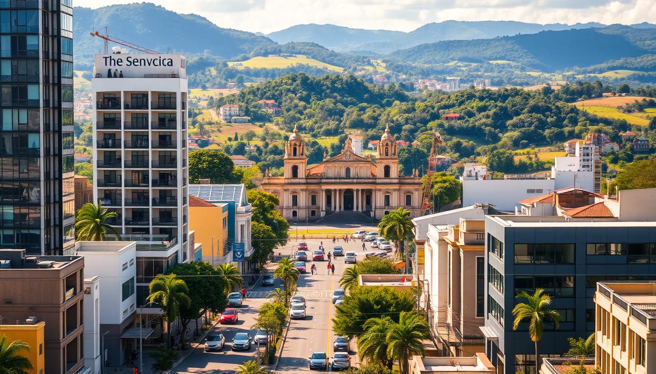 A bustling city skyline with modern high-rises, towering cranes, and construction sites dotting the landscape. In the foreground, a vibrant city square teeming with people - residents and visitors strolling, dining at outdoor cafes, and browsing local shops. The middle ground features a winding river with boats and bridges, reflecting the city's growth and progress. In the background, rolling hills and lush greenery provide a natural contrast to the urban development. The scene is bathed in warm, golden afternoon light, conveying a sense of optimism and progress. The overall atmosphere is one of a thriving, dynamic city on the move, capturing the essence of Teixeira's evolving landscape and future plans.